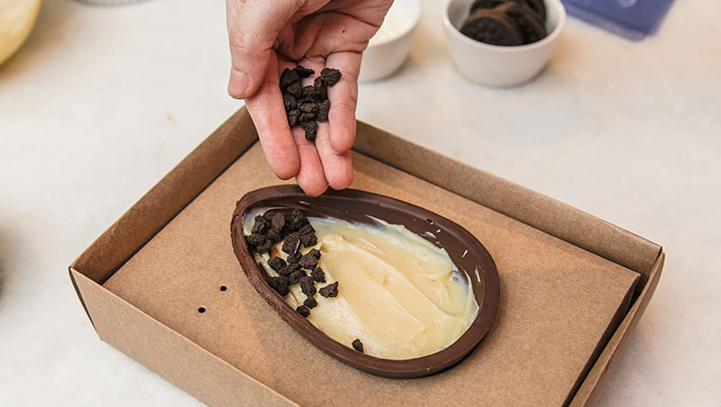 Coloque o recheio do brigadeiro de biomassa dentro do ovo e cubra o recheio com mais uma camada de chocolate até que o recheio não fique aparente.